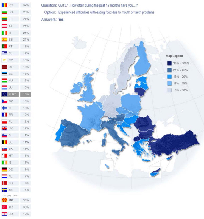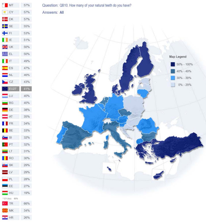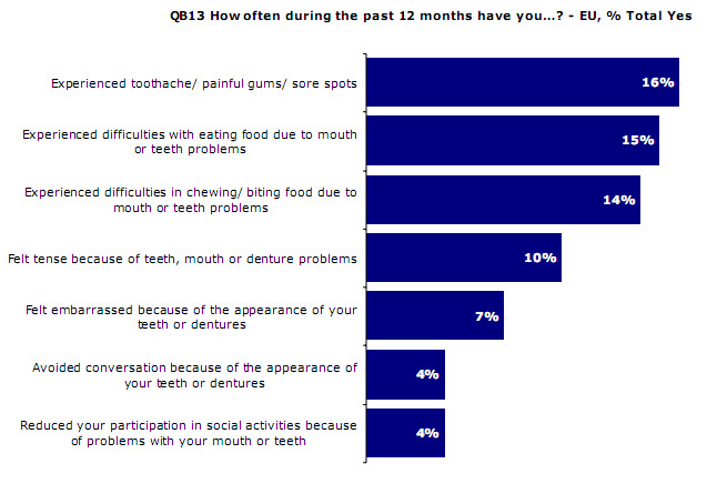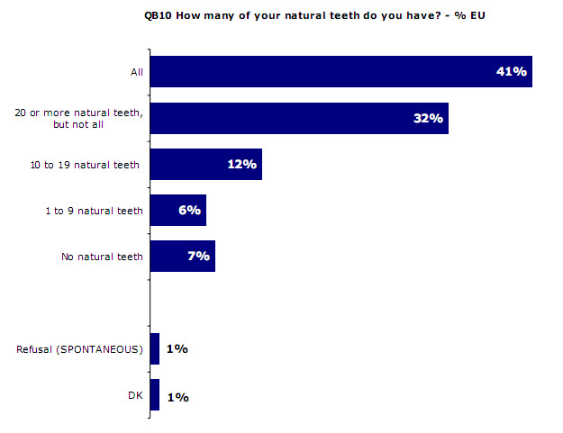 A vasta maioria dos europeus dizem que não sentem quaisquer limitações funcionais ou desconforto causados pelos seus dentes. No entanto, apenas 14 por cento dos europeus dizem que têm todos os dentes naturais.