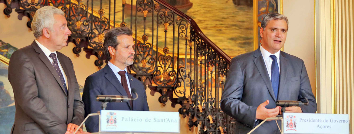 Conferência de imprensa no Palácio de Sant’Ana, sede da Presidência do Governo Regional dos Açores (12 junho 2014). Da esquerda para a direita, Artur Lima (representante da Região Autónoma dos Açores no Conselho Diretivo da OMD), Orlando Monteiro da Silva (bastonário da OMD) e Vasco Cordeiro (presidente do Governo Regional dos Açores).