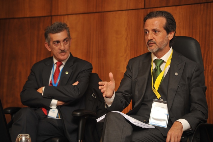 À esquerda, Juan Carlos Llodra, do Consejo General de Colegios de Odotólogos y Estomatólogos de España, e Orlando Monteiro da Silva, bastonário da Ordem dos Médicos Dentistas e moderador da sessão.