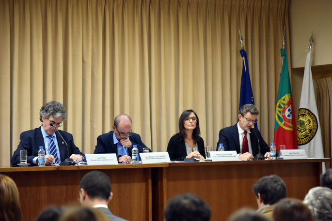 Mesa da Assembleia Geral composta por, da esquerda para a direita, Luís Vidal (secretário), Joel Ribeiro dos Santos (secretário), Natália Lucas Nunes (vice-presidente) e João Caramês (presidente).