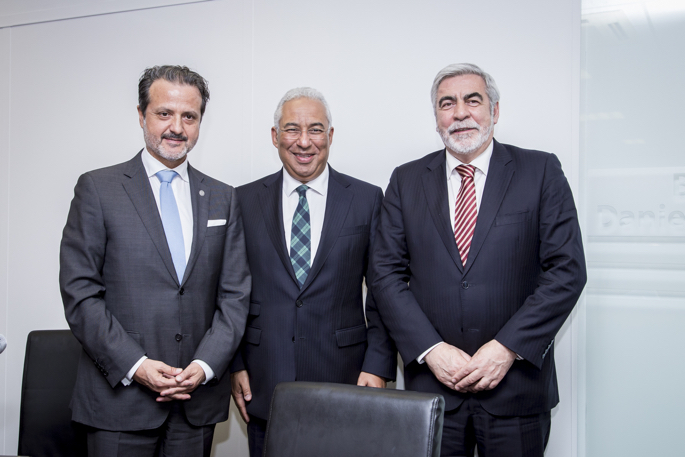 Da esquerda para a direita, Orlando Monteiro da Silva, bastonário da Ordem dos Médicos Dentistas e presidente do Conselho Nacional das Ordens Profissionais, António Costa, primeiro-ministro, e José Carlos Resende, bastonário da Ordem dos Solicitadores e dos Agentes de Execução, onde decorreu o encontro.