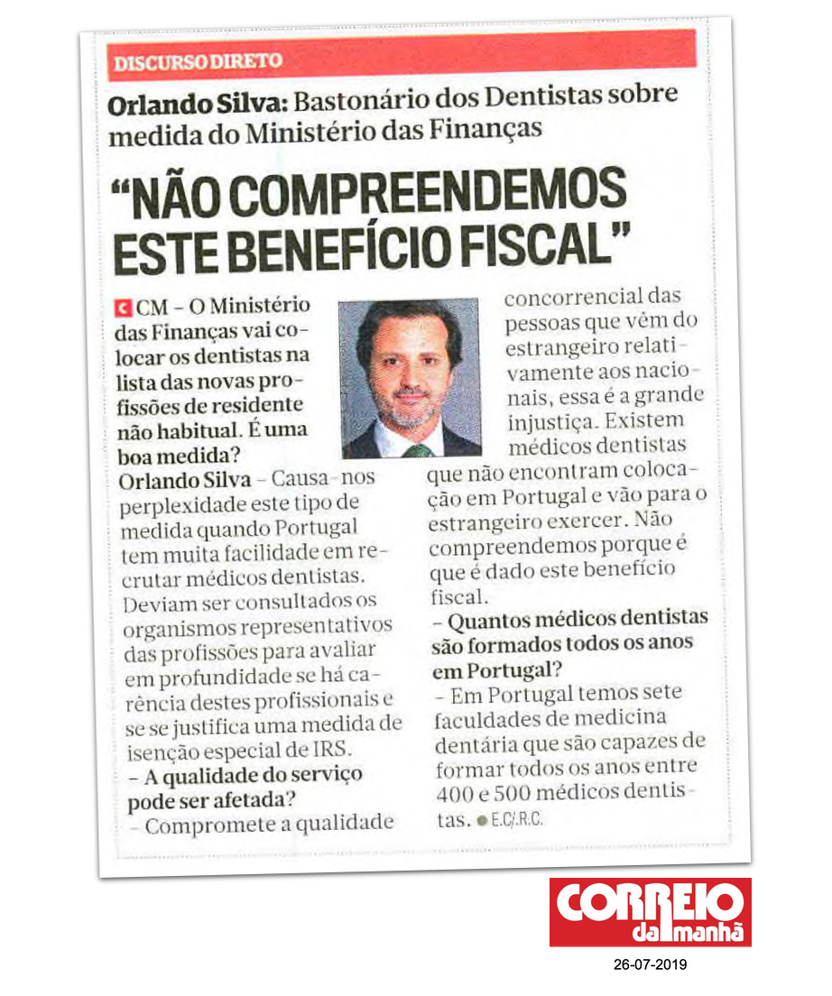 Orlando Monteiro da Silva diz que “esta medida é extremamente lesiva e sobretudo afrontosa para os médicos dentistas que cumprem com esforço as suas obrigações fiscais e com a segurança social, sem falar no pagamento de seguros e taxas à Entidade Reguladora da Saúde. São médicos dentistas que agora vão trabalhar ao lado de colegas que residem no estrangeiro a beneficiar de taxas fixas de IRS de apenas 20% porque o Ministério das Finanças português tem apenas como fim arrecadar receita sem olhar a meios e sobretudo a consequências.