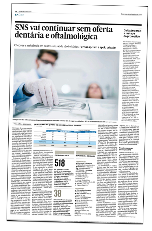 O Expresso denuncia ainda a questão da carreira de médico dentista no SNS, que aguarda resposta do Ministério das Finanças há dois anos, e destaca as opções disponíveis no setor público. Nomeadamente o cheque-dentista, cuja cobertura, explica o bastonário “é muito restrita” e nos casos das crianças, jovens e grávidas, discriminatória, pois exclui quem recorre ao setor privado.