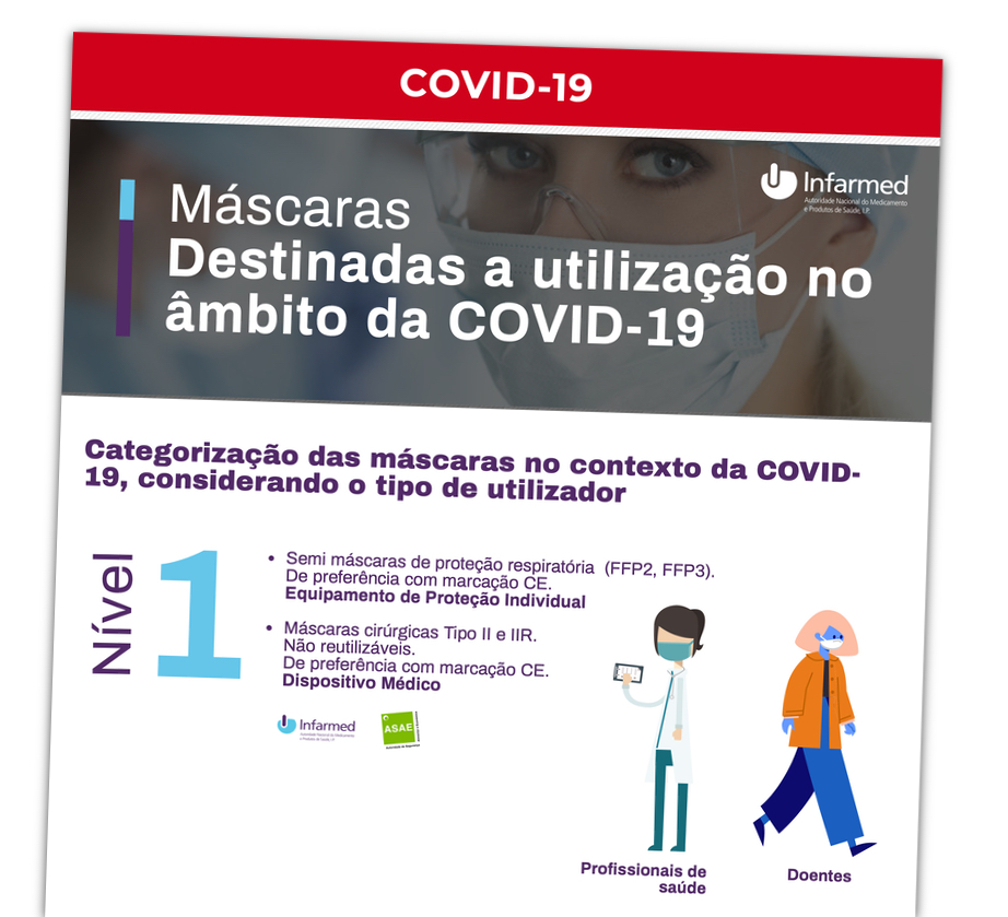 A circular nº96/CD/2020 do INFARMED, I.P. (pdf) vem esclarecer a tipologia de máscaras e respetiva utilização de acordo com a fase em que o país se encontra atualmente, a de desconfinamento. Para esse efeito, é aconselhada a consulta dos seguintes documentos emanados pela Direção-Geral da Saúde (DGS): a Norma no 07/2020 (pdf), de 29/03/2020, destinada a profissionais de saúde, a Orientação no 19/2020 (pdf), de 03/04/2020, destinada a outros profissionais e a Informação no 09/2020 (pdf), de 13/04/2020, destinada a todas as pessoas.