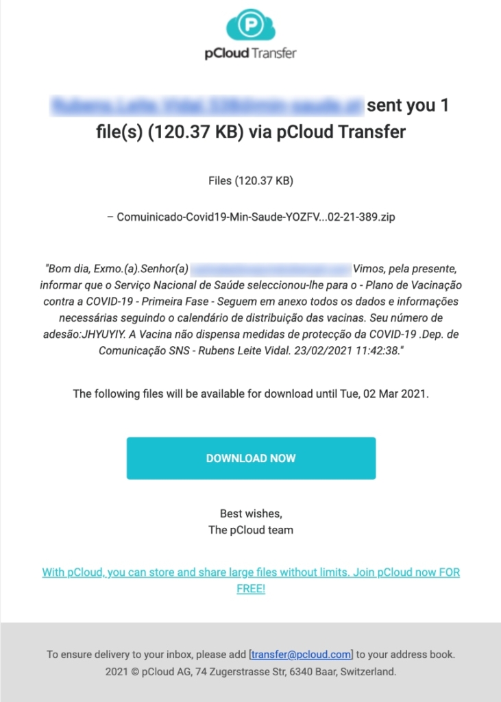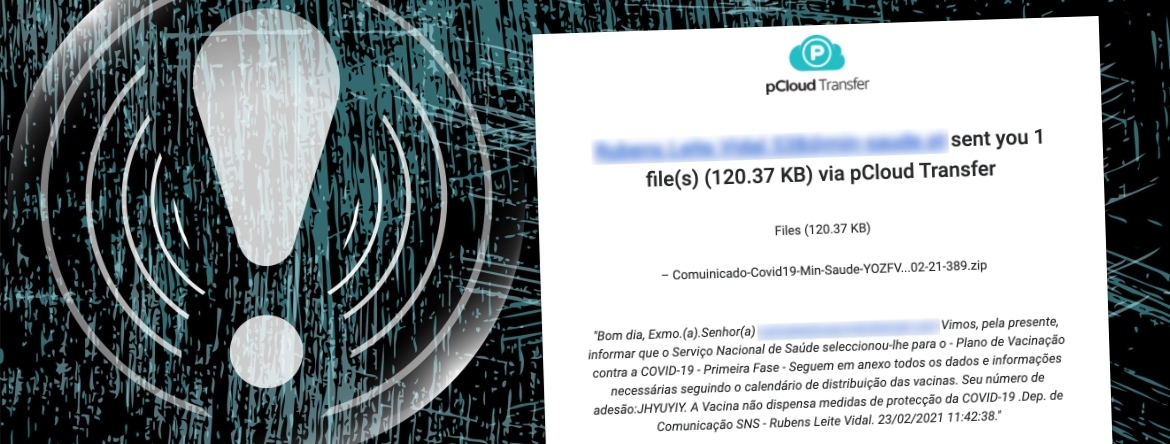 A propósito da vacinação contra a COVID-19, tem circulado uma mensagem de correio eletrónico fraudulenta em nome do Serviço Nacional de Saúde (SNS), que tem como único objetivo roubar os dados de quem carrega nos endereços indicados na mensagem.