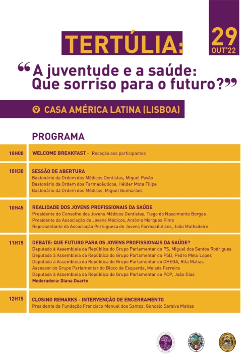 A tertúlia arranca com a participação dos bastonários da OMD, Miguel Pavão, dos Médicos, Miguel Guimarães, e dos Farmacêuticos, Hélder Filipe, que vão traçar o perfil e o panorama das respetivas profissões. Para discutir o futuro, vão estar presentes os jovens deputados à Assembleia da República dos vários grupos parlamentares.
