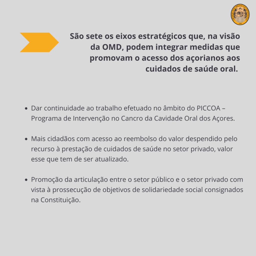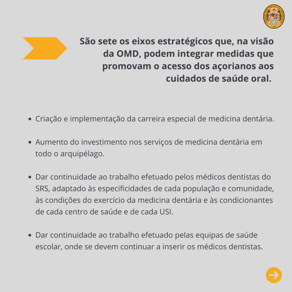 Aumento do investimento nos serviços de medicina dentária em todo o arquipélago: a OMD lembra que, no âmbito do PIES – Programa de apoio ao Investimento em Equipamentos e Infraestruturas, tem vindo a ser feito o levantamento de necessidades de intervenção, logo, a aquisição de equipamentos de medicina dentária para reabilitação/reforço da capacidade instalada dos cuidados de saúde primários deve contemplar todas as ilhas nas quais essa necessidade se verifique.