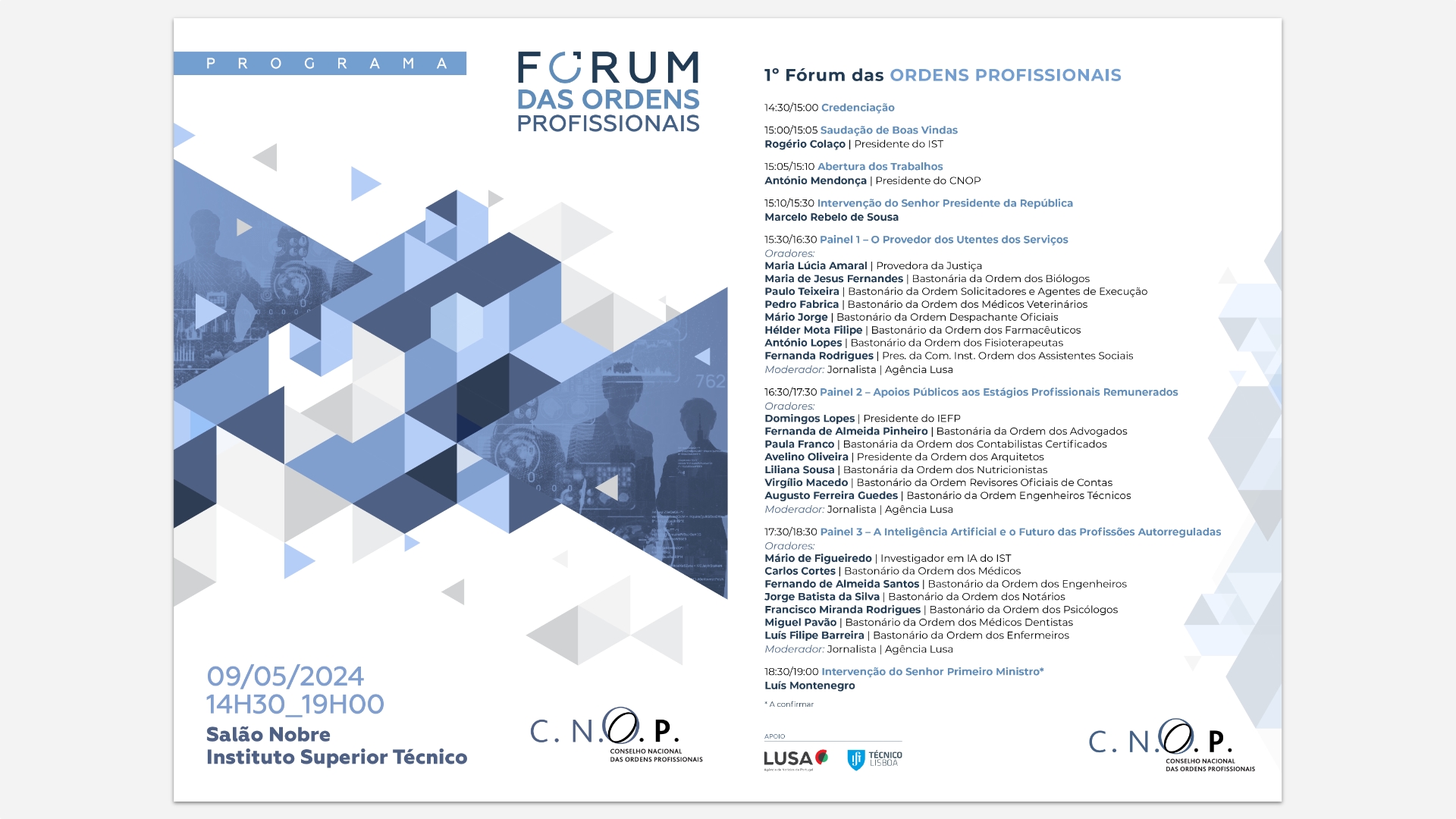 De acordo com o CNOP, estarão representadas 18 associações profissionais e o Presidente da República, Marcelo Rebelo de Sousa, fará uma intervenção antes da realização do primeiro painel. Por confirmar está ainda a presença do primeiro-ministro, Luís Montenegro.