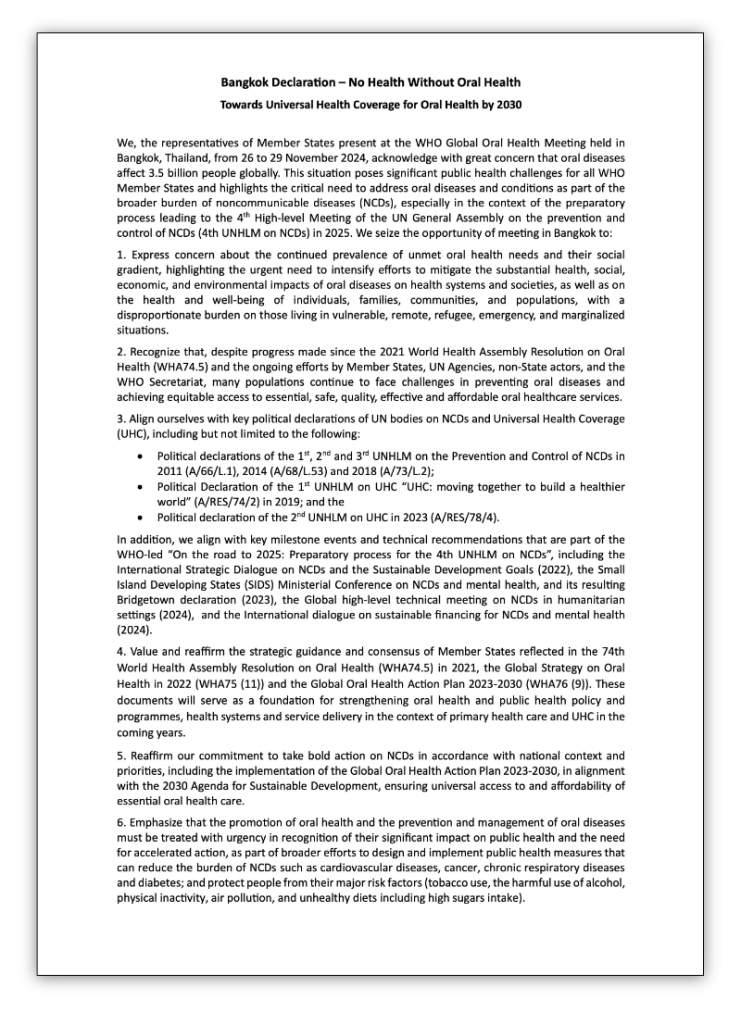 A publicação da Declaração de Bangkok, que resulta da primeira reunião global de saúde oral da Organização Mundial de Saúde (OMS), entre os dias 26 e 29 de novembro, na capital da Tailândia, representa mais um passo significativo em direção ao objetivo de incluir a saúde oral na agenda das doenças não transmissíveis (DNT) e nos programas de cobertura universal de saúde.