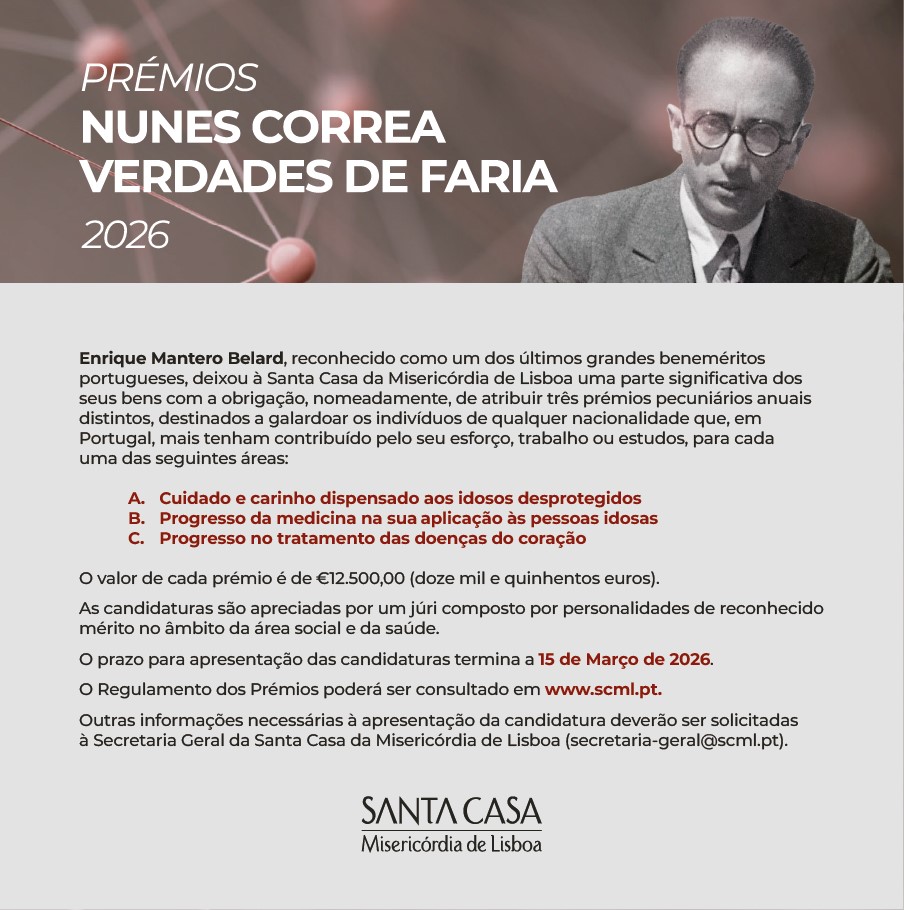 Até dia 15 de março, a Santa Casa da Misericórdia de Lisboa (SCML) está a receber candidaturas para os Prémios Nunes Correa Verdades de Faria, que visam distinguir o mérito nas áreas da medicina e dos cuidados geriátricos.