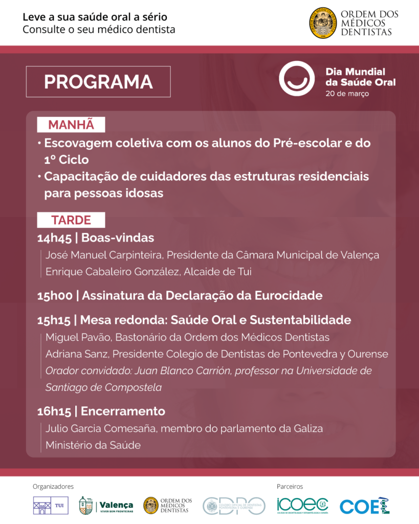 O Dia Mundial da Saúde Oral será dinamizado por equipas de médicos dentistas portugueses e espanhóis. Durante a manhã, o programa inclui uma masterclass de escovagem direcionada aos cerca de 1000 alunos do Pré-escolar e do 1.º Ciclo do Ensino Básico do Agrupamento de Escolas Muralhas do Minho e dos centros escolares de Tui.