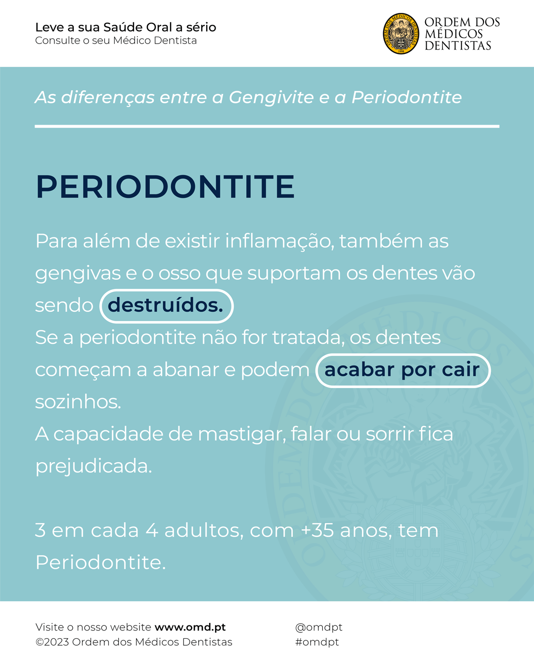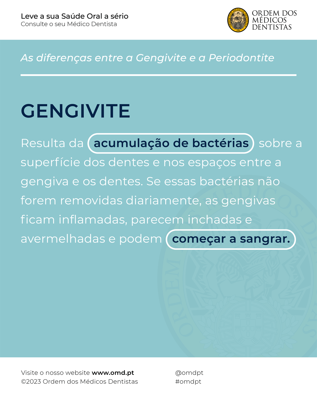 Dentro das doenças periodontais, importa destacar a gengivite e a periodontite. Ambas resultam do desequilíbrio entre a agressão das bactérias e a capacidade de resposta do organismo, isto é, são causadas pela reação do nosso corpo às bactérias que se acumulam na boca e que causam inflamação.