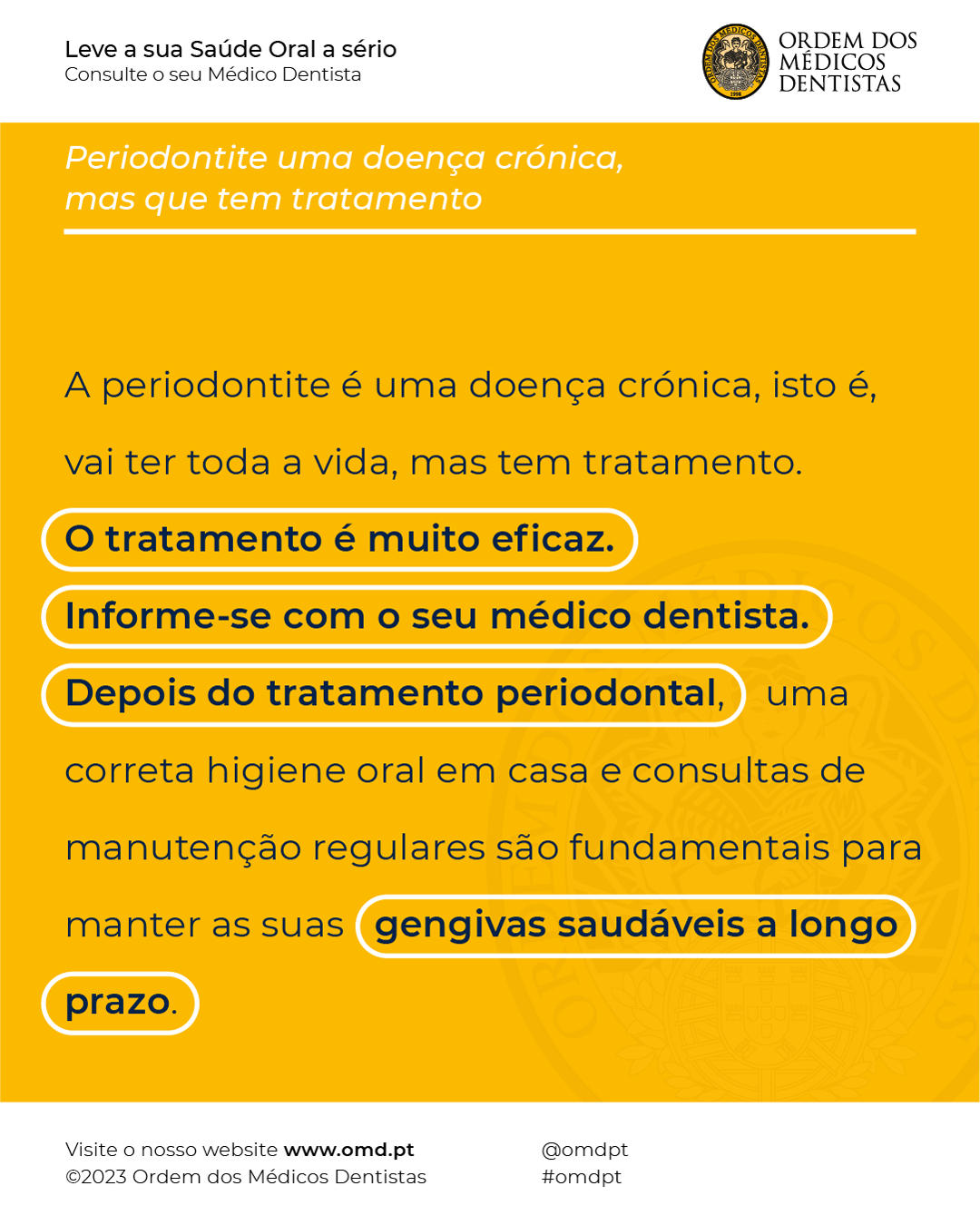 Além disso, mesmo depois de tratada, se em casa não tiver os cuidados adequados ou se não fizer consultas de manutenção regulares com o seu médico dentista, pode haver recidiva da doença.