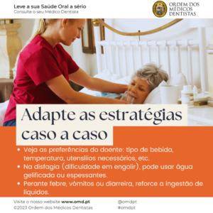- Quando possível, tenha em conta as preferências do doente (tipo de bebida, temperatura, tipo de utensílios utilizados).