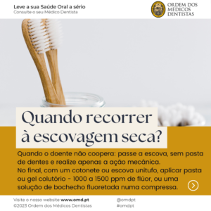 - Se o doente não cooperar, pode ser realizada a escovagem seca. Consiste em passar a escova nos dentes sem pasta dentária e realizar apenas a ação mecânica. No final com um cotonete ou escova unitufo, aplicar pasta ou gel colutório, de 1000 a 1500 ppm de flúor, ou com uma compressa, passar solução de bochecho fluoretada.