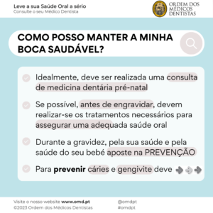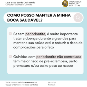 Primeiro que tudo, deve ter atenção à higiene oral, à alimentação e ao estilo de vida, assim como visitar o médico dentista de forma regular.Se tiver periodontite, é essencial tratar o problema na gravidez para manter a sua saúde oral e a do bebé. Faça uma consulta de diagnóstico com o seu médico dentista. A periodontite não controlada potencia o risco de pré-eclâmpsia, parto prematuro e/ou baixo peso ao nascer.