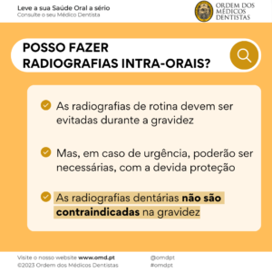 As radiografias dentárias não são contraindicadas na gravidez, mas, idealmente, devem ocorrer apenas em casos urgentes.